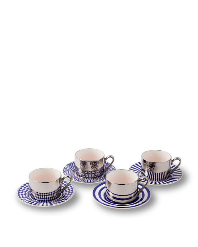 Zilveren kopjes met 4 verschillende schoteltjes
